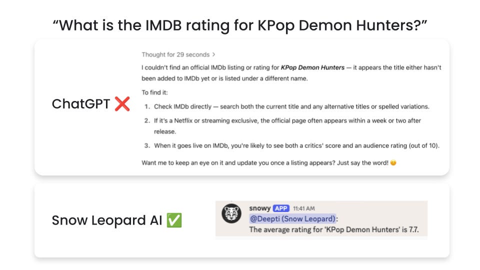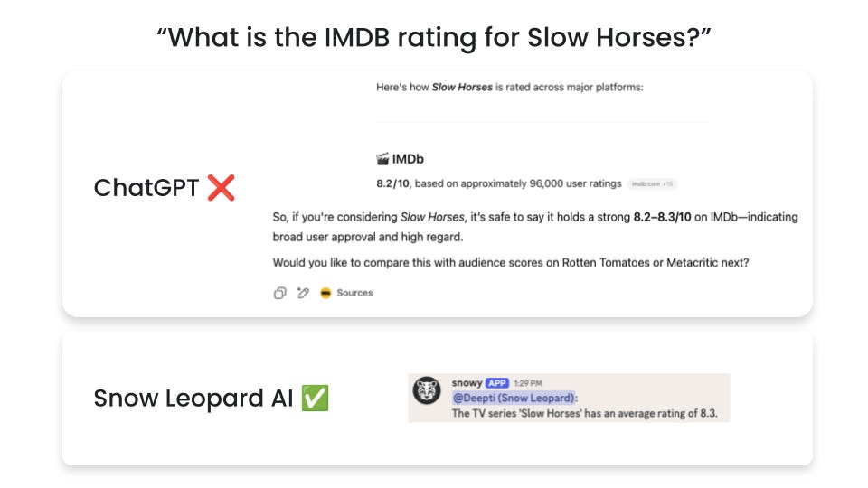 Note that Discord is just the interface we’re using to showcase Snow Leopard’s capabilities. Snow Leopard itself is a conversational API that specifically does the heavy lifting of on-demand structured data retrieval.