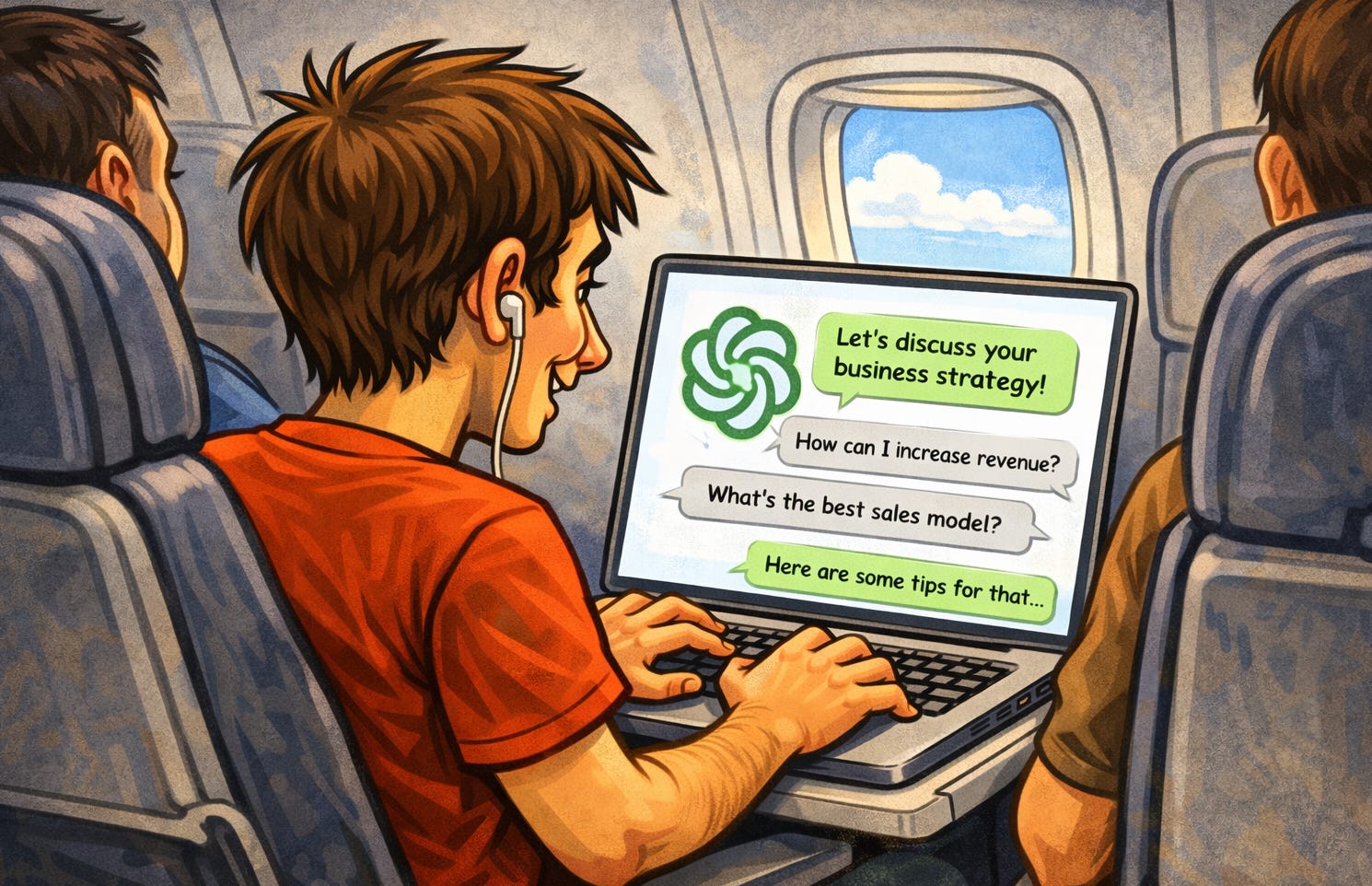 Sitting next to me in the middle seat was someone that seemed to be a college student. I couldn't help but notice that he was having a deep conversation with ChatGPT on his laptop, perched on the tray table. At a glance, the conversation was about revenue, scaling marketing activities etc. I assumed that he was doing a project for a business class or something like that. But I couldn't help my curiosity, so I actually asked him what he was doing.